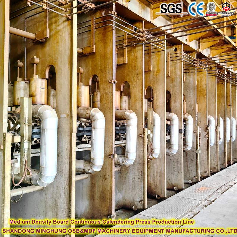 Una correa de acero en movimiento continuamente transporta la alfombra formada a alta temperatura (180-220 ° C) y presión (2.5-4.5 MPa), lo que permite el curado adhesivo y la consolidación del panel en una sola pasada.