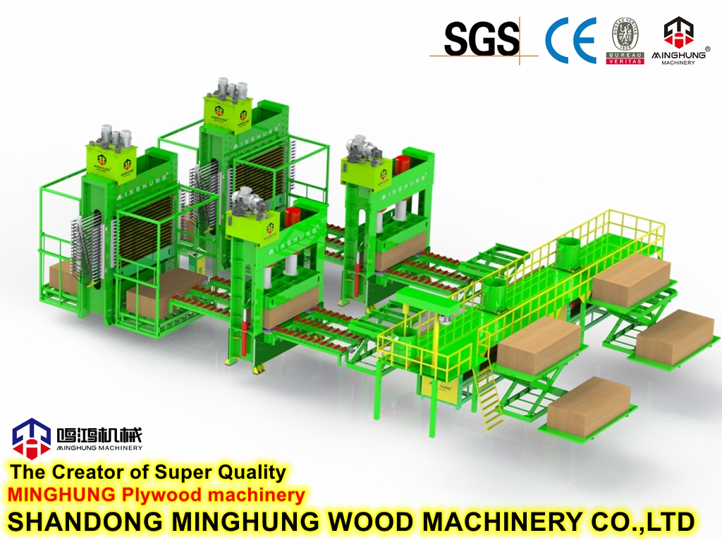 7. Hot Press: El corazón de la línea de producción; una prensa caliente de múltiples aberturas o una prensa continua, que proporciona el calor y la presión para el curado del adhesivo.